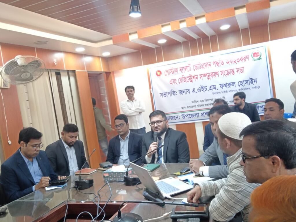 আজ মঙ্গলবার (২৩ ডিসেম্বর, ২০২৫) কালিয়াকৈর উপজেলার সরকারি কর্মকর্তা, বিভিন্ন স্কুল ও কলেজের শিক্ষকবৃন্দকে নিয়ে পোস্টাল ব্যালটে ভোট প্রদান বিষয়ে অবহিতকরণ ও রেজিস্ট্রেশন কার্যক্রম সংক্রান্ত এক সভা অনুষ্ঠিত হয়েছে।