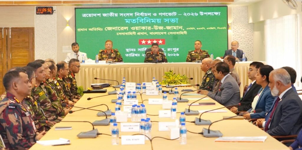 ত্রয়োদশ জাতীয় সংসদ নির্বাচন ও গণভোট-২০২৬ উপলক্ষ্যে সার্বিক আইনশৃঙ্খলা পরিস্থিতি মূল্যায়ন এবং ‘ইন এইড টু দ্য সিভিল পাওয়ার’ এর আওতায় মোতায়েনরত সেনাসদস্যদের কার্যক্রম পরিদর্শনের লক্ষ্যে সেনাবাহিনী প্রধান জেনারেল ওয়াকার-উজ-জামান, এসবিপি, ওএসপি, এসজিপি, পিএসসি রংপুর ও রাজশাহী সফর করেছেন।