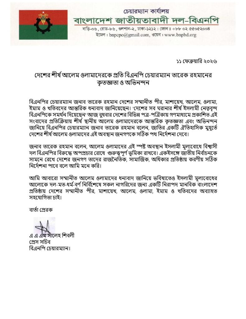 আজ বুধবার (১১ ফেব্রুয়ারি, ২০২৬) বিকালে এক বিবৃতিতে তিনি এসব কথা বলেন।
