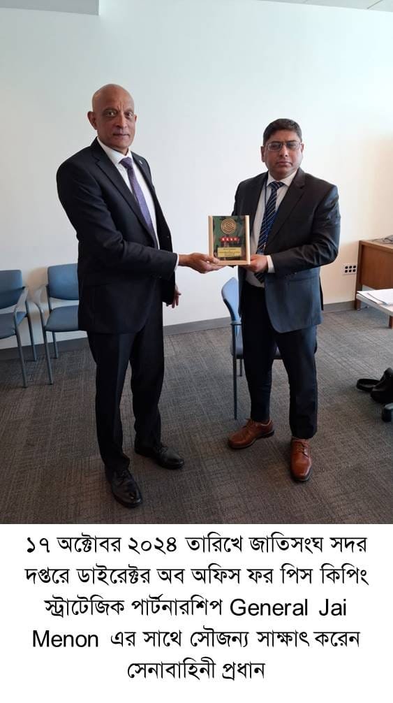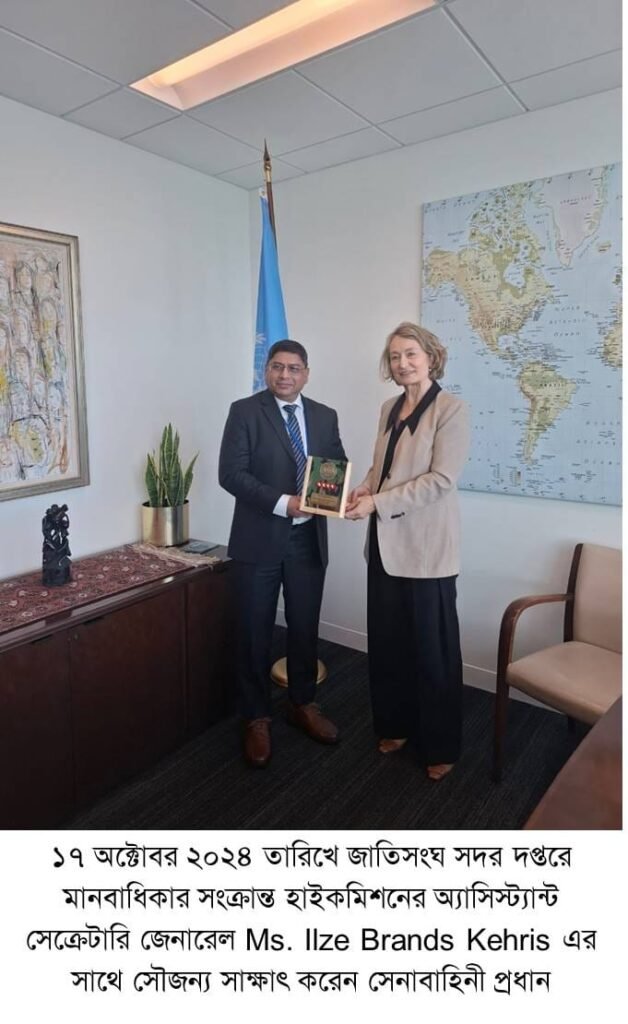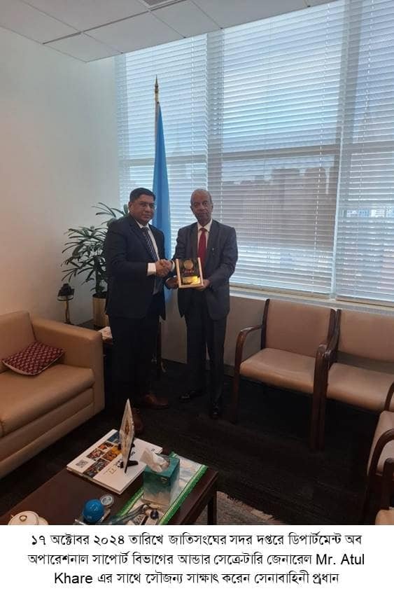 গত ১৭ অক্টোবর ২০২৪ সেনাবাহিনী প্রধান নিউইয়র্কে অবস্থিত জাতিসংঘ সদর দপ্তরে জাতিসংঘের ডিপার্টমেন্ট অব পিস অপারেশনস বিভাগের আন্ডার সেক্রেটারি জেনারেল Mr. Jean Pierre Lacroix, ডিপার্টমেন্ট অব অপারেশনাল সাপোর্ট বিভাগের আন্ডার সেক্রেটারি জেনারেল Mr. Atul Khare, জাতিসংঘের মানবাধিকার সংক্রান্ত হাইকমিশনের অ্যাসিস্ট্যান্ট সেক্রেটারি জেনারেল Ms. Ilze Brands Kehris, আন্ডার সেক্রেটারি জেনারেল, ডিপার্টমেন্ট অব পলিটিক্যাল ও পিস বিল্ডিং অ্যাফেয়ার্স এর পক্ষে মধ্যপ্রাচ্য, এশিয়া এবং প্যাসিফিক বিষয়ক অ্যাসিস্ট্যান্ট সেক্রেটারি জেনারেল Mohammed Khaled Khiari এবং ডাইরেক্টর অব অফিস ফর পিস কিপিং স্ট্রাটেজিক পার্টনারশিপ General Jai Menon এর প্রত্যেকের সাথে দ্বি-পাক্ষিক বৈঠকে মিলিত হন।