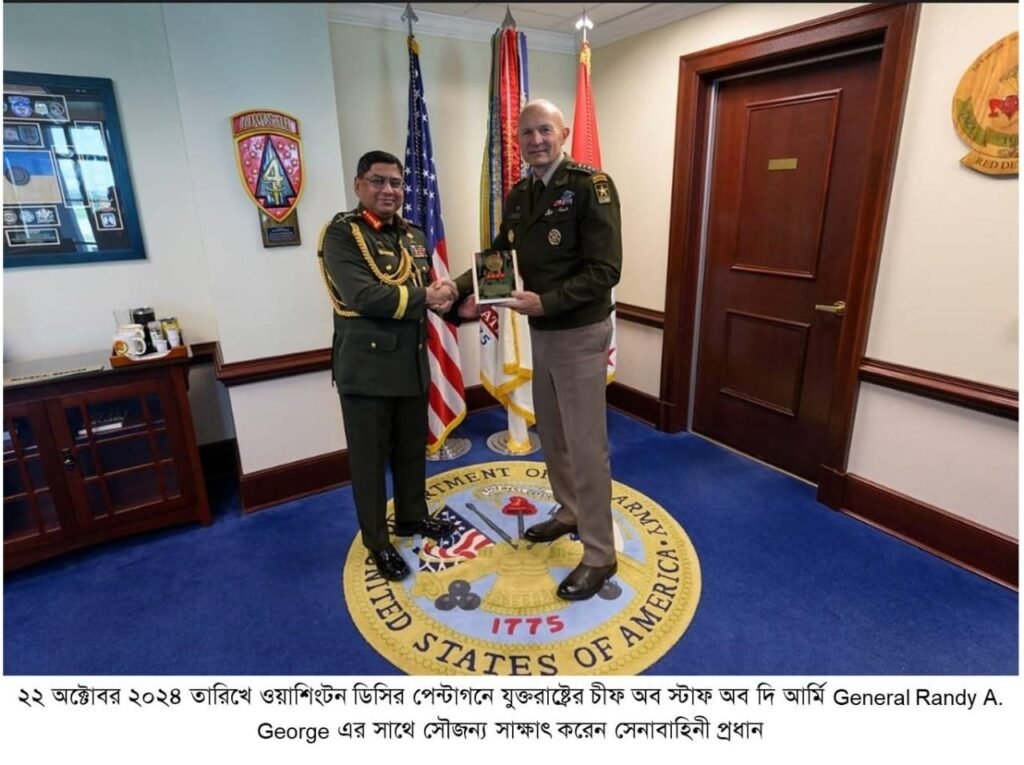 গত ২২ অক্টোবর ২০২৪ সেনাপ্রধান ওয়াশিংটন ডিসির পেন্টাগনে যুক্তরাষ্ট্রের চীফ অব স্টাফ অব দি আর্মি General Randy A. George এর সাথে সৌজন্য সাক্ষাৎ ও আলোচনায় অংশগ্রহণ করেন। সাক্ষাৎকালে তাঁরা দুই দেশের সেনাবাহিনীর স্বার্থ সংশ্লিষ্ট বিষয়, বিশেষ করে জাতিসংঘ শান্তিরক্ষা মিশন, প্রশিক্ষণ সহায়তা, দ্বি-পাক্ষিক সম্পর্কোন্নয়ন ও পারস্পরিক আস্থা সৃষ্টি, আঞ্চলিক নিরাপত্তা বিষয়ে পারস্পরিক সহযোগিতা, দুর্যোগ পরবর্তী মানবিক সহায়তা, যৌথ প্রশিক্ষণ সংক্রান্ত বিষয়াদি আলোচনা করেন। এ সময় যুক্তরাষ্ট্রের সেনাপ্রধানের বৈদেশিক নীতি বিষয়ক উপদেষ্টা উপস্থিত ছিলেন।