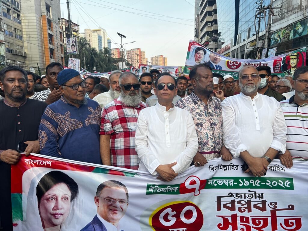 ঐতিহাসিক ৭ই নভেম্বর জাতীয় বিপ্লব ও সংহতি দিবস উপলক্ষে শুক্রবার (৭ নভেম্বর, ২০২৫) রাজধানীতে বর্ণাঢ্য র্যালির আয়োজন করা হয়। র্যালিটিতে নেতৃত্ব দেন দলটির ক্ষুদ্র ঋণ বিষয়ক সম্পাদক ও ঢাকা-১১ সংসদীয় আসনের নেতা ড. এম এ কাইয়ুম।